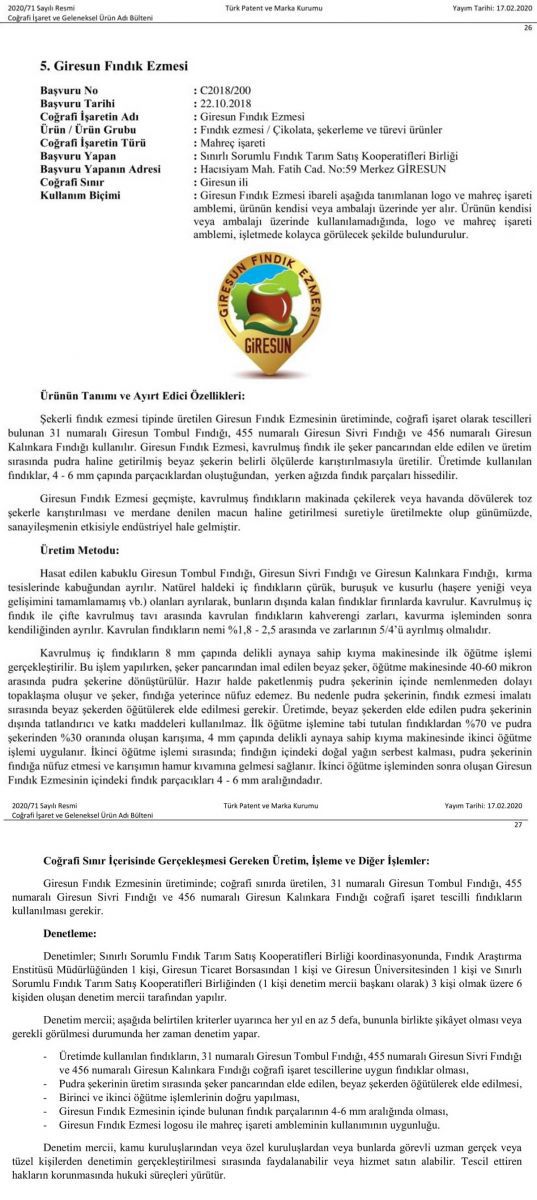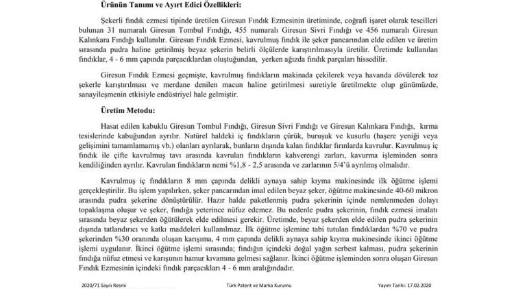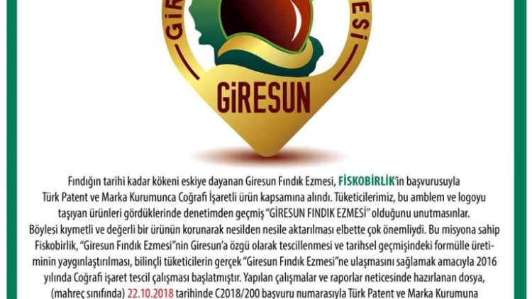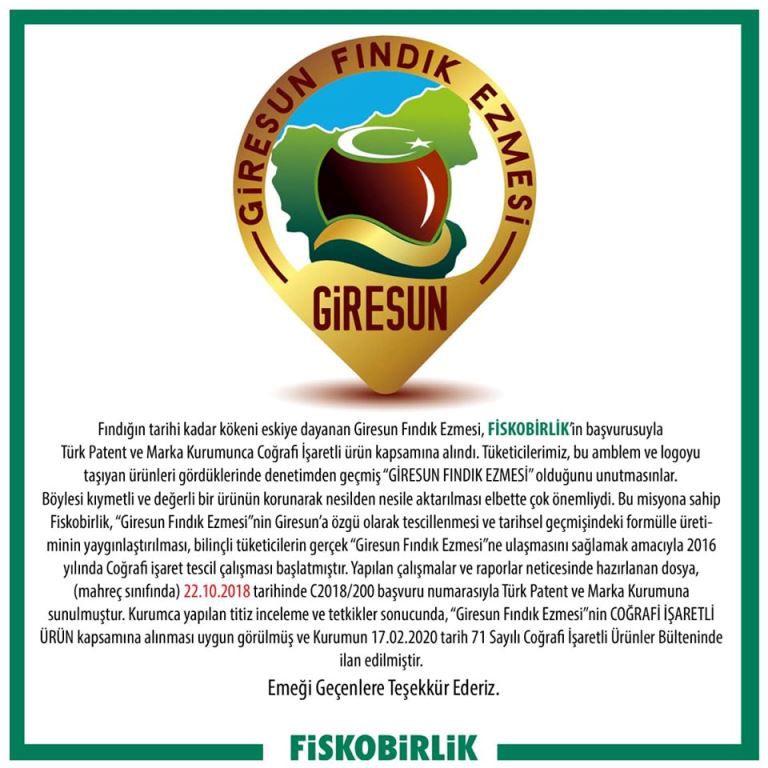 Böylesi kıymetli ve değerli bir ürünün korunarak nesilden nesile aktarılması elbette çok önemliydi. Bu misyona sahip Fiskobirlik, “Giresun Fındık Ezmesi”nin Giresun’a özgü olarak tescillenmesi ve tarihsel geçmişindeki formülle üretiminin yaygınlaştırılması, bilinçli tüketicilerin gerçek “Giresun Fındık Ezmesi”ne ulaşmasını sağlamak amacıyla 2016 yılında Coğrafi işaret tescil çalışması başlatmıştır. Yapılan çalışmalar ve raporlar neticesinde hazırlanan dosya, (mahreç sınıfında) 22.10.2018 tarihinde C2018/200 başvuru numarasıyla Türk Patent ve Marka Kurumuna sunulmuştur. Kurumca yapılan titiz inceleme ve tetkikler sonucunda, “Giresun Fındık Ezmesi”nin COĞRAFİ İŞARETLİ ÜRÜN kapsamına alınması uygun görülmüş ve Kurumun 17.02.2020 tarih 71 Sayılı Coğrafi İşaretli Ürünler Bülteninde ilan edilmiştir.