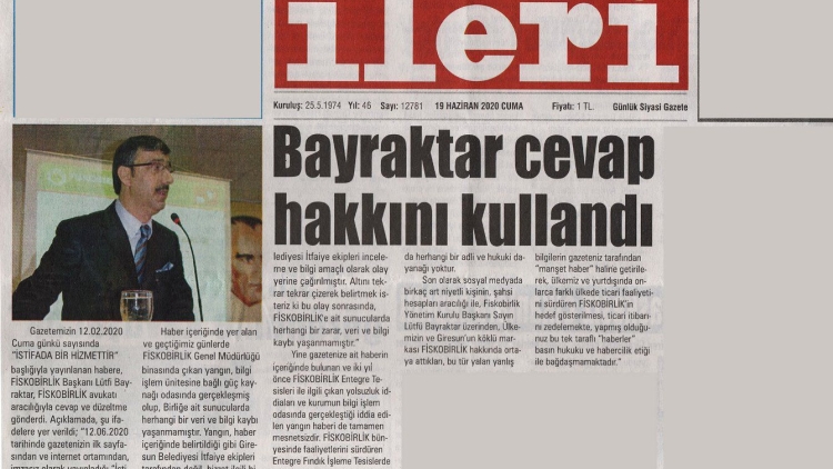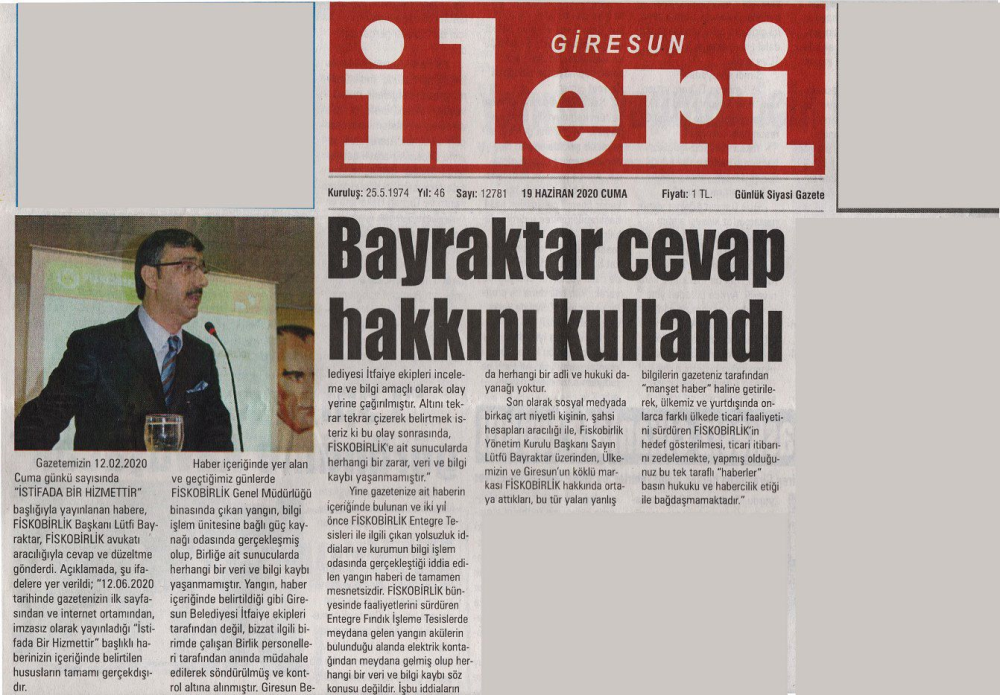 Giresun İleri Gazetesi, 12.06.2020 tarihli gazetenin manşetinden verdiği haberinde, FİSKOBİRLİK ve Yönetim Kurulu Başkanımız Sayın Lütfi BAYRAKTAR ile ilgili “İstifada Bir Hizmetdir” manşetiyle yayınladığı ve içeriği doğru olmayan ( YALAN HABER) bilgilere yer vermiştir.